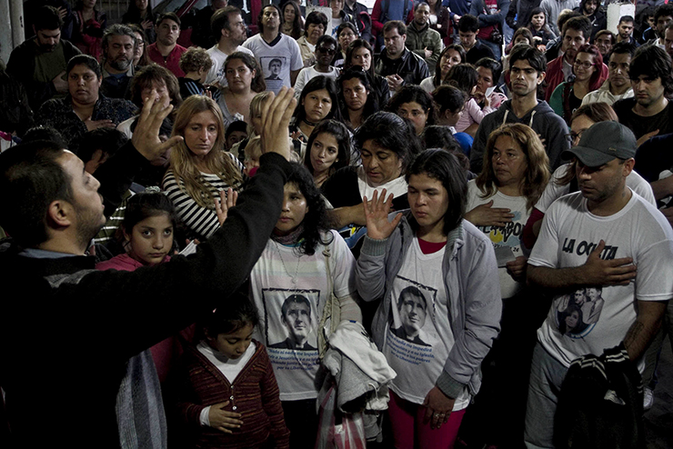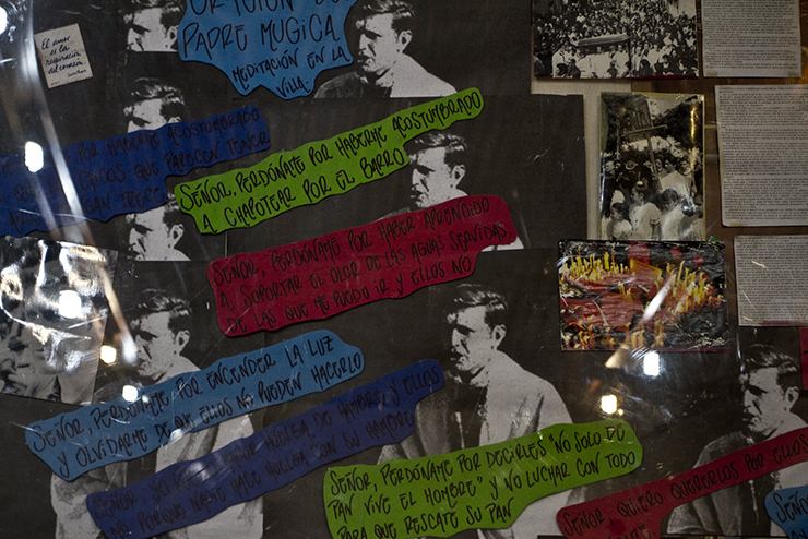 Los restos del padre Carlos Mujica están en la entrada de la parroquia de villa 31, donde los curas villeros trabajan en talleres para que la juventud salga del paco (droga). A metros del panteón, un centro de Acceso a la Justicia (CAJ) articula con la iglesia para llevar las políticas del Estado al barrio. En la semana de su natalicio, los integrantes de varios CAJ de la ciudad de Buenos Aires junto a organizaciones sociales y vecios marcharon desde el monumento a Mujica -emplazado este año frente a la casa de la Recoleta donde nació-, hasta la parroquía Crsto Obrero, que el mismo cura construyó antes que lo asesinara una patota de la triple A.